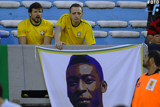 Hinchas brasileños con la bandera que muestra a su gran ídolo Pelé.