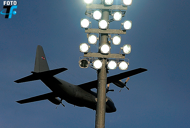 El avión a hélices de la Fuerza Aérea aparece volando por detrás de una de las torres de iluminación.
