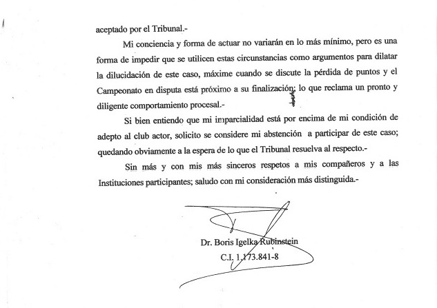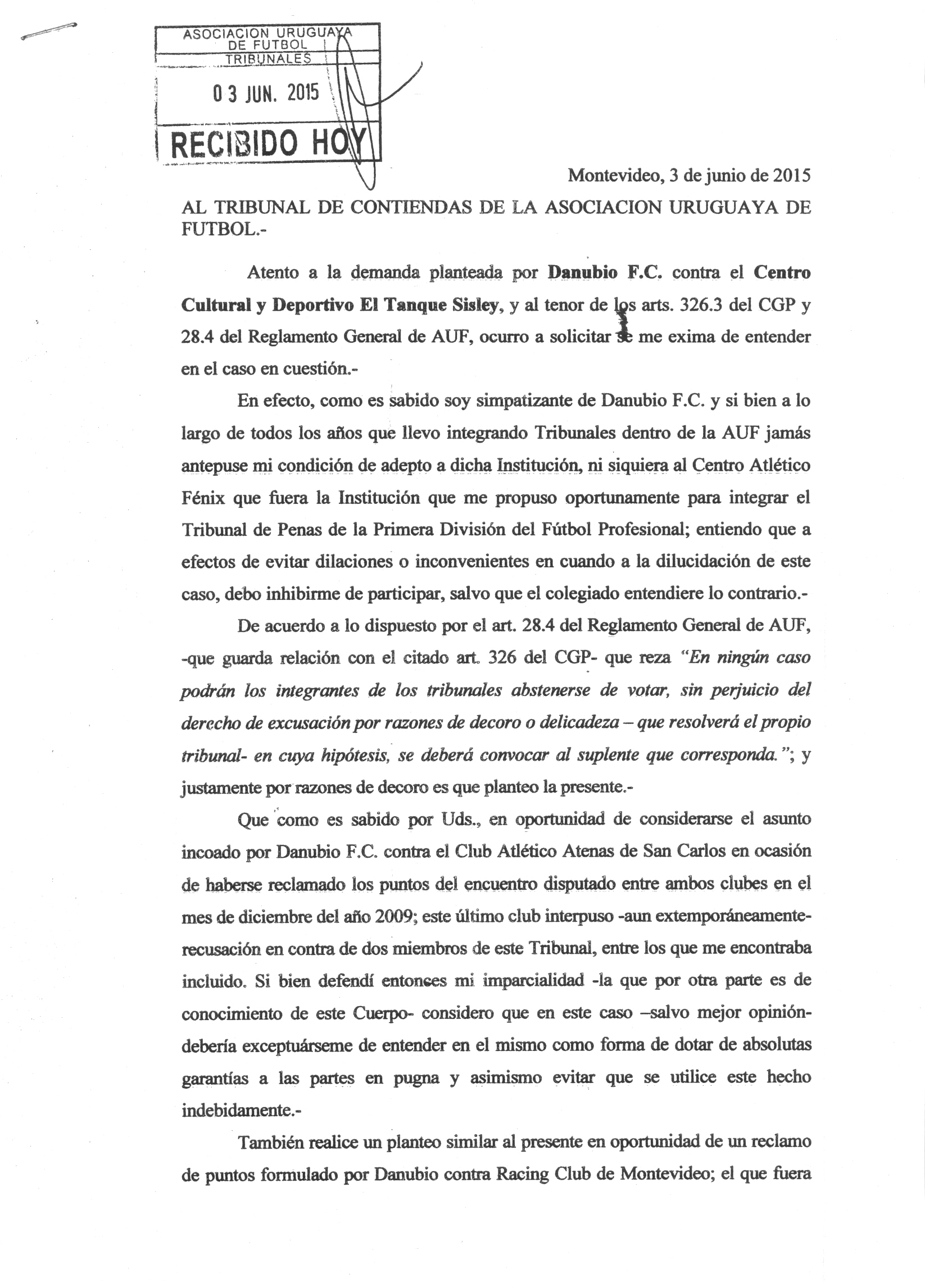 A la hora 17.30, el Dr. Boris Igelka se presentó en la sala de sesiones del Tribunal de Contiendas y entregó una nota a la secretaria administrativa del órgano en la que se excusa de actuar en el asunto de la demanda por reclamo de puntos que Danubio le realizó en ese órgano a El Tanque Sisley.