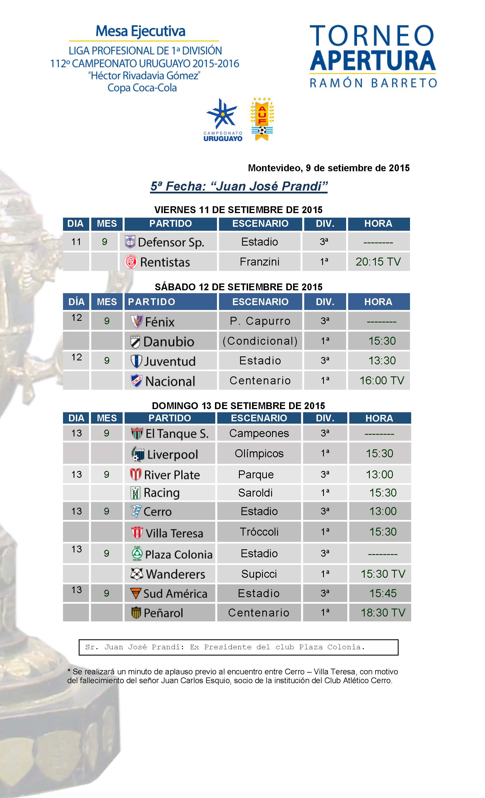 La Mesa Ejecutiva fijó la quinta fecha del Torneo Apertura, con la sola variante de la condicionalidad del Parque Capurro para el encuentro entre Fénix – Danubio, que jugarán el sábado desde la hora 15.30. El escenario fue inhabilitado por la Policía pero el jueves volverá a ser inspeccionado. De acuerdo a las manifestaciones del presidente albivioleta Álvaro Chijane a la Mesa Ejecutiva, la situación ha sido regularizada.