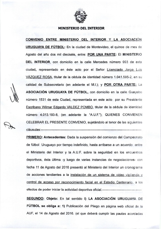 Paralelamente, y mientras no esté instalado el sistema, el Ministerio compromete presencia policial en los partidos que la AUF determine sea necesaria en el Campeonato Uruguayo Especial que comenzará el sábado 27 de agosto venidero. El convenio de 3 carillas es el siguiente: