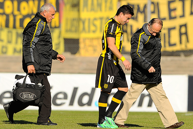 SANIDAD: El kinesiólogo Héctor Peña, atendió a los jugadores de Peñarol en la cancha por la suspensión preventiva a Germinal López. El Dr. Mario Pagano, como se aprecia en la imagen con “Japo” Rodríguez, deberá declarar la próxima semana junto al Dr. Alfredo Rienzi por el caso Darío Rodríguez.