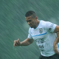 Egidio Arévalo Ríos en pleno trabajo bajo intensa lluvia este viernes por la tarde en el complejo deportivo de la AUF.