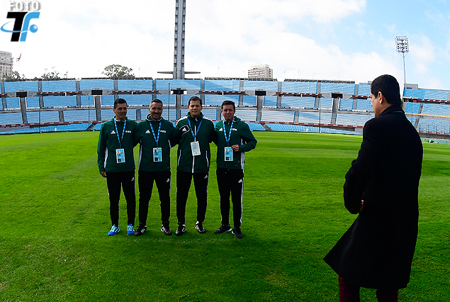 La cuarteta de jueces peruanos posan juntos en el Estadio Centenario. Oscar Julián Ruiz atento.