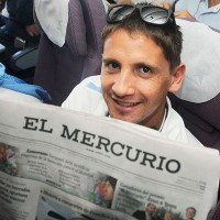 Sonriente el fraybentino Ramírez en pleno vuelo lee el diario chileno "El Mercurio".