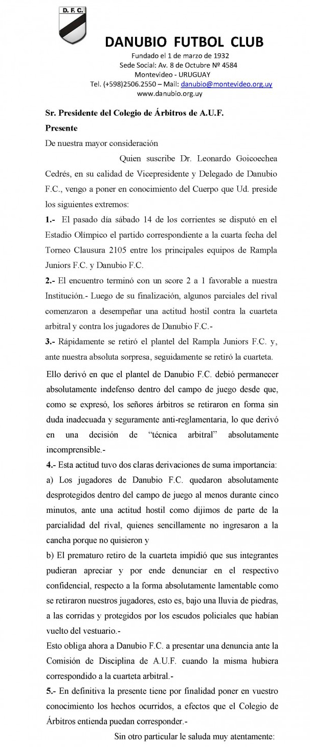 Es copia de la nota presentada por Leonardo Goicoechea ante la Comisión de Árbitros de la AUF, denunciando la actitud del árbitro Federico Arman de retirarse prematuramente a instancias de la policía, cuando aún no había salido el equipo de Danubio. Para Goicoechea, la cuarteta debe permanecer en la cancha hasta que se retire el último de los futbolistas.