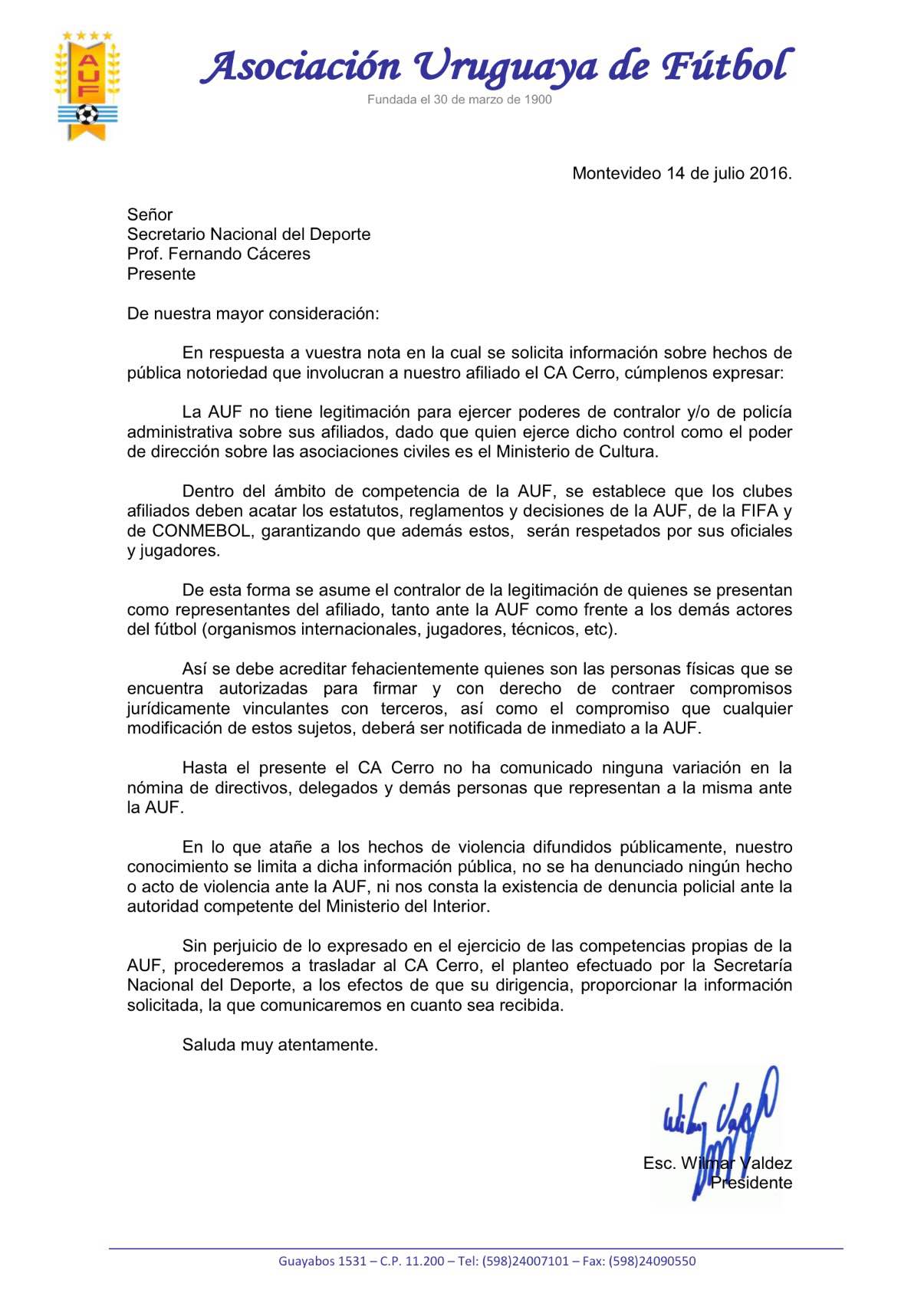A la hora 19.55 y dentro del plazo de 48 horas que le otorgó la Secretaría Nacional del Deporte a la AUF, el Consejo Ejecutivo remitió a ese órgano de gobierno la respuesta solicitada a manera de apercibimiento sobre el asunto del Club Atlético Cerro: