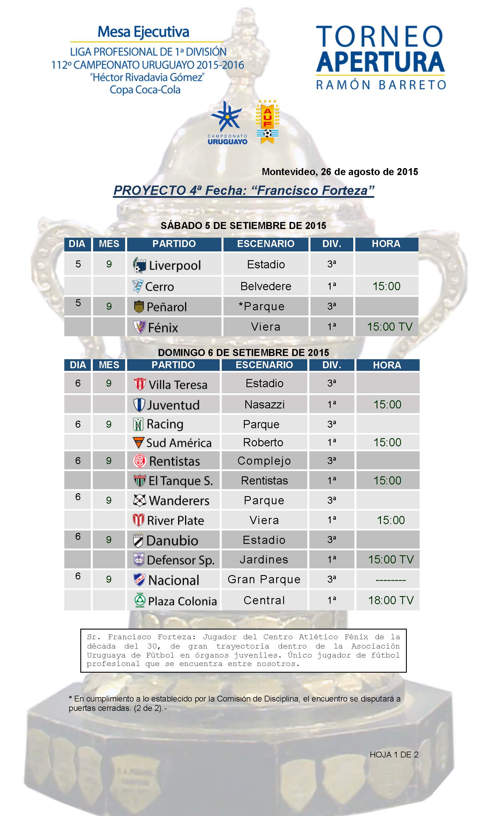 Fecha 4: Peñarol-Fénix el sábado 5; el domingo Danubio-Defensor hora 15.15 y Nacional-Plaza 18.15