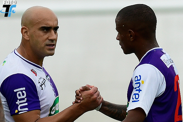 Raúl Ferro y Mathías Acuña en el saludo de gol.