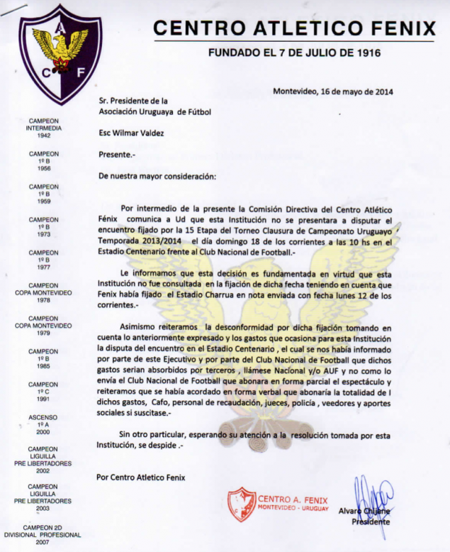 La Directiva de Fénix envió nota a la AUF, informando que su equipo no se presentará a disputar el partido ante Nacional. “El Ec. Eduardo Ache me mintió. No cumplió con su palabra, me dijo que estaba todo solucionado y que se iban a ser cargo de los gastos. Pero hoy me entero que no es así, que Fénix debía asumir con los gastos que implica habilitar el Estadio Centenario. Por esa razón, determinamos no presentarnos a jugar ante Nacional. Pagaremos la multa que asciende a unos 350.000 pesos y punto final al tema”, palabra de Alvaro Chijane, presidente de Fénix.