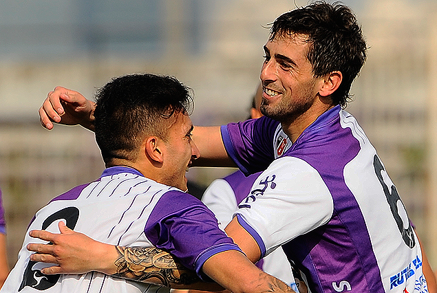 Leandro Zazpe en el festejo del primer gol abrazado por Andrés Schetino en la alegría albivioleta.