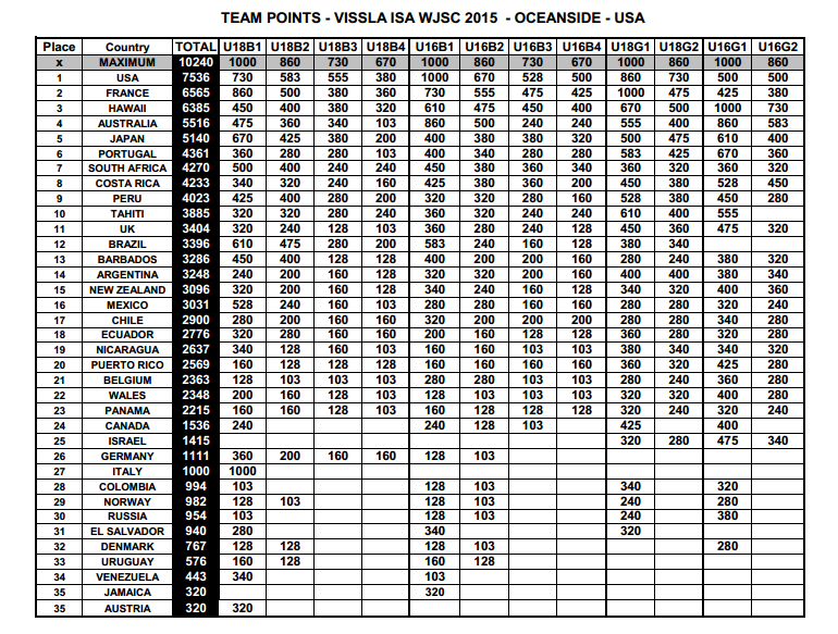 Después de una semana histórica de competencia que incluyó a 322 de los mejores surfistas de 36 países, el VISSLA ISA World Junior Surfing Championship 2015 ha llegado a su fin. Estados Unidos fue coronado el Campeón Mundial por equipos por la primera vez en la historia de la competencia.