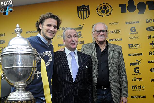 Diego Forlán, en su despedida de Peñarol, con Juan Pedro Damiani y Pablo Forlán, el padre del 10.