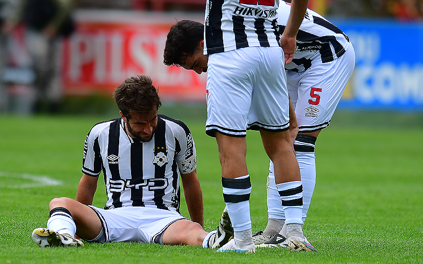 Francisco Cerro, tendido en el césped tras sufrir un golpe en el primer tiempo, que le generó una lesión en el peroné izquierdo. El futbolista, siguió jugando y fue reemplazado en el entretiempo.