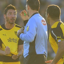 Juan Manuel Olivera se toma la camiseta y le protesta a viva voz a Darío Ubriaco por el penal que no sancionó. El árbitro le mostró tarjeta amarilla al delantero.