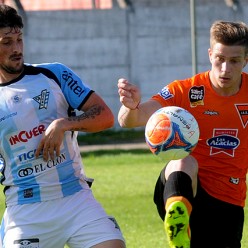 Matías Masiero en la intención de cruzar a Federico Gallego, el dueño de la pelota en San José.