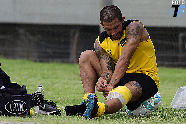 DOLORIDO: “Lolo” Estoyanoff también salió, en el segundo tiempo, dolorido también por la “paralítica” que le provocó inflamación en la rodilla izquierda. El delantero fue asistido por la sanidad. Situaciones de juego en partido de entrenamiento y precaución.