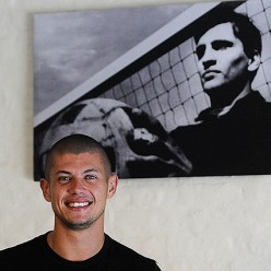 -Un inmenso mural de Ladislao Mazurkiewicz recibe a los visitantes a la concentración de Los Aromos. Gastón Guruceaga posó delante de la fotografía del inolvidable arquero, considerado el mejor de todos los tiempos. ¿Lo conoció, sabe de quién se trata?