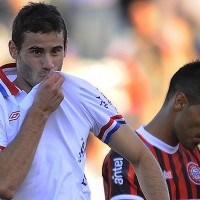 Gastón Pereiro besa la casaca tras anotar su segundo gol, el que comenzó a cerrar la victoria ante Miramar Misiones.