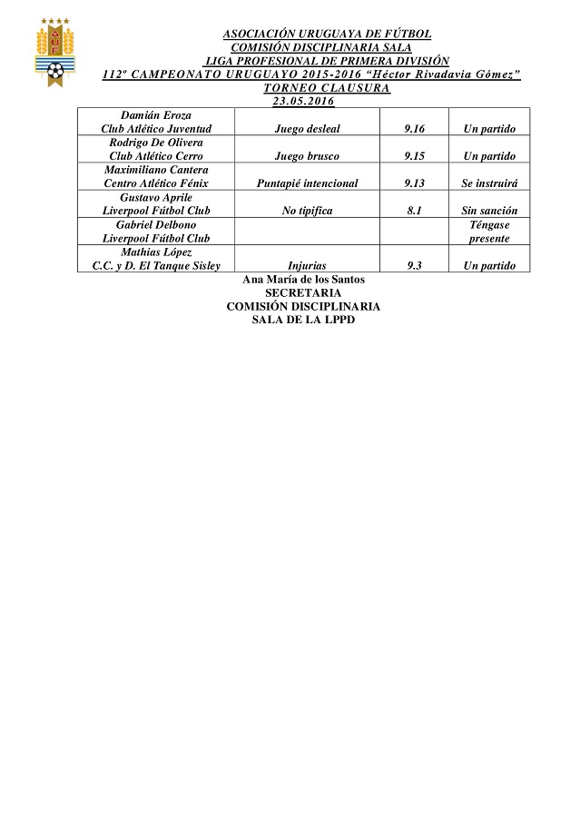 La Comisión Disciplinaria dictó los fallos de los asuntos que tenía pendientes de la antepenúltima fecha del Torneo Clausura jugada el fin de semana pasado. Se destaca la rehabilitación condicional (no figura en el boletín que ilustra este informe) concedida a Guillermo Rodríguez y que fuera gestionada por el delegado de Peñarol Dr. Jorge Barrera. Rodríguez había cumplido la mitad de la pena de dos partidos y como no tenía antecedentes, el órgano jurisdiccional lo rehabilitó y podrá actuar el domingo próximo frente a Plaza Colonia.