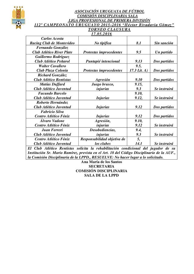 Guillermo Rodríguez, de Peñarol, fue suspendido por dos partidos. No fue concedida la rehabilitación condicional para Mario Ramírez de Rentistas y el órgano determinó instruir el partido suspendido entre Juventud – Fénix, cuyo fallo se conocerá la próxima semana.