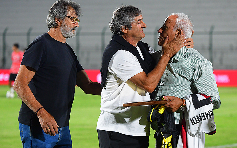 Antonio Alzamendi, el gran homenajeado de la noche, recibiendo una placa de honor y saludado por Enzo Francescoli (actual director deportivo de River Plate) y Walter "Indio" Olivera (actual director de relaciones institucionales de Peñarol).