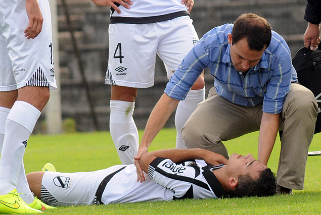 Marcelo Tabárez, tendido en el suelo, visiblemente dolorido se toma el hombro derecho asistido por el Dr. Leonardo Schiavone.