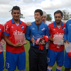 Porras, Polenta, "Nacho", Recoba y Ribair con las plaquetas que les obsequió Danubio.