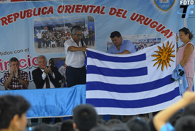 Momento en que Juan Castillo, con la colaboración del presidente de Juventud de Las Piedras, Yamandú Costa, despliegan la enorme bandera uruguaya que las autoridades de la AUF obsequiaron a la escuela pública que funciona en la urbanización Los Olivos, de Lima y que lleva el nombre de nuestro país. En la mesa que presidió el acto, aparece el embajador de Uruguay acreditado ante el gobierno de Perú, Carlos Barros y el presidente de AUF, Esc. Wilmar Valdez.