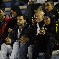 El peruano Paolo Hurtado y Emiliano Albin en el grupo de jugadores de Peñarol que siguieron el partido en la Tribuna América.