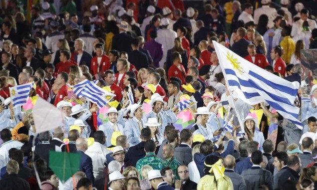 Lola Moreira porta la bandera uruguaya en la fiesta inaugural de Río de Janeiro 2'016.