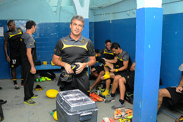 Pablo Bengoechea en el vestuario del estadio Tróccoli. El “Profesor” comenzó con victoria su ciclo de entrenador aurinegro.