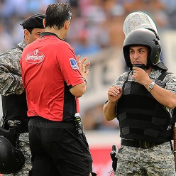 El árbitro Darío Ubriaco, tras dar por finalizado el partido en el minuto 83, conversa con los efectivos policiales encargados del operativo policial.