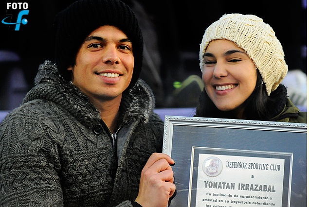 RECONOCIMIENTO: De la directiva de Defensor Sporting, encabezada por el presidente Daniel Jablonka, al golero Yonatan Irrazábal (hoy en Cerro). Antes de empezar el partido se le entregó una placa al ex arquero que se formó en los violetas “en testimonio de agradecimiento y amistad” por su pasaje en el club del Parque Rodó. Irrazábal siguió las incidencias desde la tribuna visitante con su pareja.