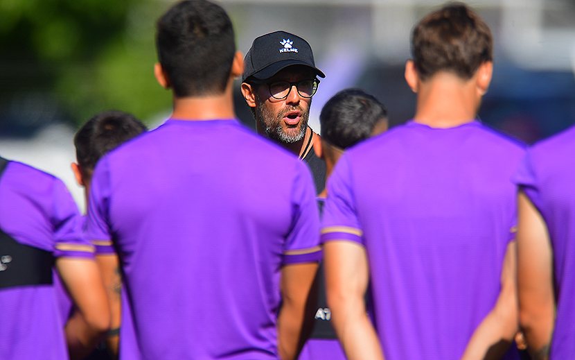 Tras los saludos de presentación con los futbolistas en zona de camarines, ya en cancha con la correspondiente ropa deportiva de fajina, mantuvo la primera charla con sus dirigidos por espacio de diez minutos, de la que también tomaron parte todos los componentes del staff, incluidos médicos, fisioterapeutas y utileros.