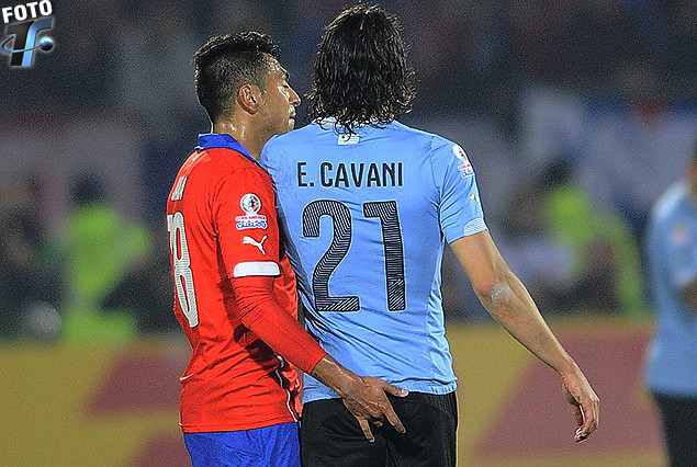 Fotografía exclusiva de Tenfield.com. Gonzalo Jara y la agresión en contra de Edinson Cavani. El defensor chileno en el momento preciso que le introduce un dedo en el ano al delantero uruguayo.