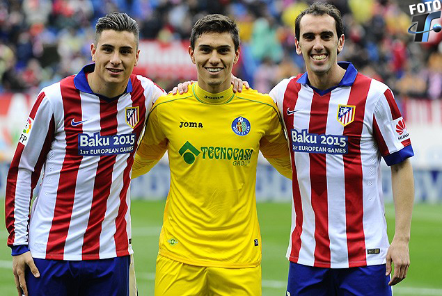José María Giménez, Emiliano Velázquez y Diego Godín, tres uruguayos en cancha en el estadio Vicente Calderón de Madrid. Godín y Giménez conformando la consistente zaga de Atlético de Madrid y del otro lado Emiliano Velázquez, en la defensa de Getafe.