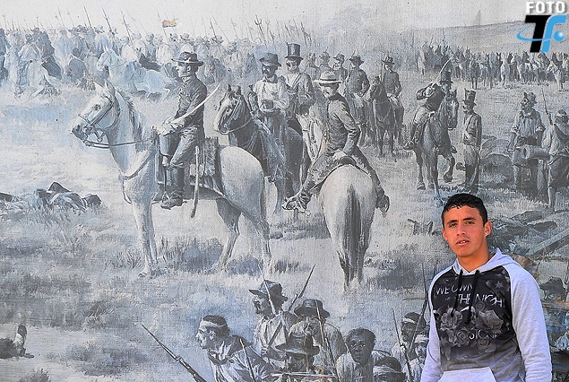 Juan De Dios Pintado posa delante del mural de la Batalla de Las Piedras.