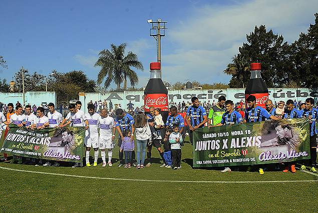 Pancartas… Los jugadores de ambos equipos junto a Alexis Viera. “Juntos x Alexis”, las leyendas en las pancartas que abrieron promocionando el partido a beneficio que se jugará el próximo 10 de octubre a partir de las 15:00 horas en el Parque Saroldi. Por otra parte, se habilitó en los locales de Abitab, la cuenta número 54720 para colaborar con el “Pulpo” y su familia.