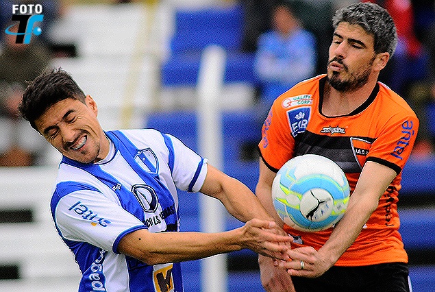 José Varela y Fabián Yantorno se disputan la posesión del balón.