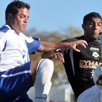 Alejandro Reyes y Maximiliano Olivera disputan el balón en el empate entre bohemios y pedrenses en el Parque Artigas.