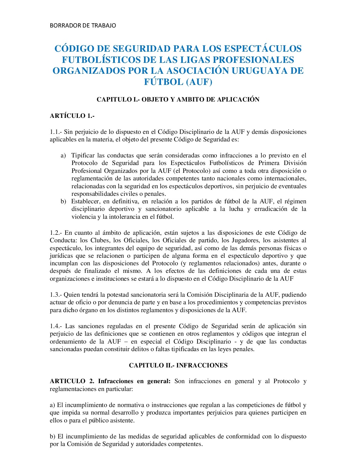 El Consejo Ejecutivo tiene pronto el borrador de trabajo que contiene el Código Sancionatorio de Seguridad para los espectáculos futbolísticos de las ligas profesionales. La nueva herramienta en materia sancionatoria será considerada el viernes en lo general por parte de la Asamblea de Clubes. La discusión en lo particular quedará para otra sesión, previo al inicio del Campeonato Uruguayo Especial.
