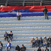 La bandera más grande del mundo, enrollada, pronta para ser desplegada. Ya fue expresamente colocada en las partes altas de las tribunas Colombes, Olímpica y Amsterdam. La misma se abrirá sobre las 14.45 horas en momentos en que saldrán juntos a los equipos a la cancha y a continuación se irradiarán los himnos nacionales de Uruguay y España. Los hinchas tricolores comienzan a poblar las distintas tribunas. La concurrencia rondará en las 40.000 personas.