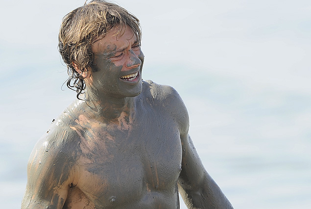 Primer plano del Capitán Diego Lugano con su cara y torso casi negros, producto de haberse pasado por su cuerpo la arena de la orilla que contiene asfalto.