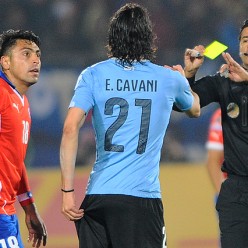 Gonzalo Jara, Edinson Cavani con la mano en la zona agredida por el chileno y el juez Sandro Ricci con la tarjeta amarilla en la mano.