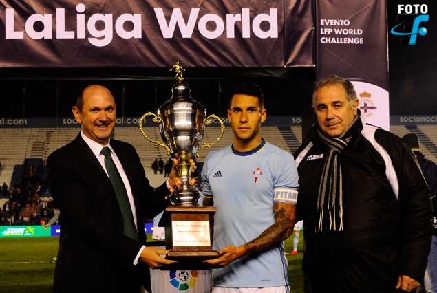 Hugo Mallo, capitán del Celta de Vigo, recibe la Copa conquistada en manos del presidente de la Federación Gallega, Rafael Louzan y Hebert Revetria de Tenfield. Celta vuelve a jugar el sábado ante Nacional en el GPC.