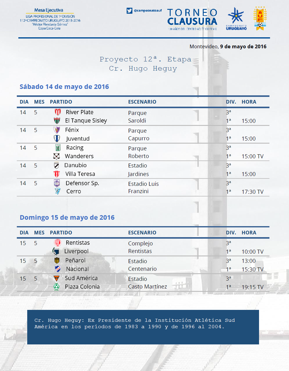 La fecha doce del Torneo Clausura lleva el nombre de Cr. Hugo Heguy, histórico presidente de Sud América que condujo a la institución en dos períodos: el primero desde 1983 a 1990 y el último a partir de 1996 a 2004.