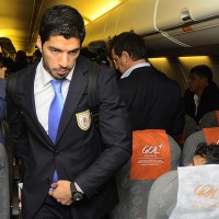 Luis Suárez en el avión de Gol que trasladó a la delegación hacia Belo Horizonte. Impecables trajes azul oscuro, con camisa blanca y corbata celeste tal como se observa en el jugador oriental.