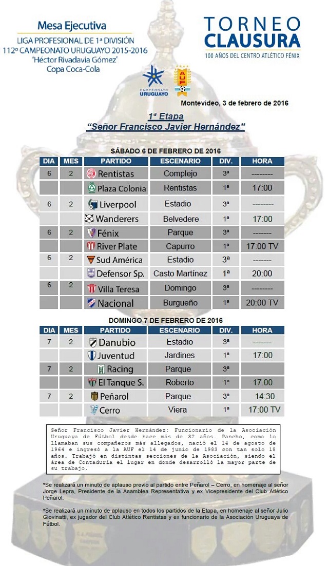 Sin modificaciones y con el agregado de que el partido de Peñarol – Cerro a jugarse en el Parque Viera el domingo, tendrá desde la hora 14.30 encuentro preliminar de tercera división a pedido de la Comisión de Seguridad, la Mesa Ejecutiva fijó la primera fecha del Torneo Clausura y el siguiente es el boletín oficial del órgano tras el acto administrativo: