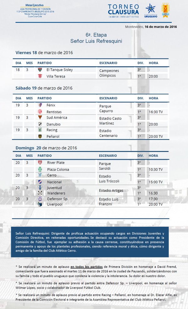 La Mesa Ejecutiva dispuso que en todos los partidos de la sexta fecha del Torneo Clausura se realice un minuto de aplauso en homenaje a David Fremd, el comerciante asesinado en Pasysandú el pasado 11 de marzo. Al respecto, en el boletín de fijación el órgano que regula el círculo de privilegio refleja el siguiente mensaje: “Se realizará un minuto de aplauso en todos los partidos de Primera División en homenaje a David Fremd, comerciante que fuera asesinado en Paysandú el pasado martes 11 de marzo de 2016, solidarizándonos con su familia y con todo el pueblo uruguayo que condena la violencia y la intolerancia. Su dolor es nuestro dolor”